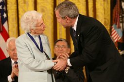 President George W. Bush congratulates Ruth Colvin after presenting her with the Presidential Medal of Freedom. Ruth's pioneering work in literacy became an early WTB project. White House photo by Eric Draper